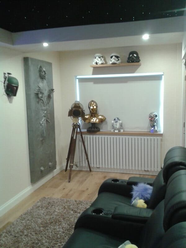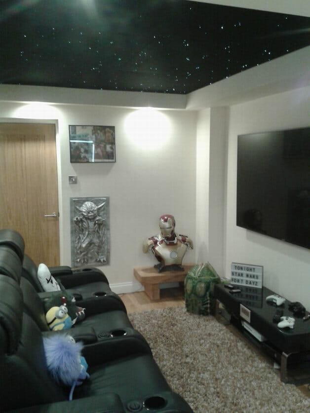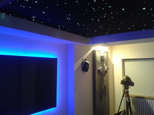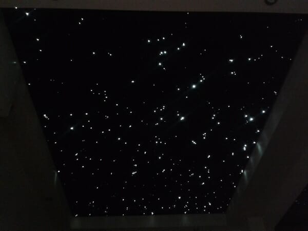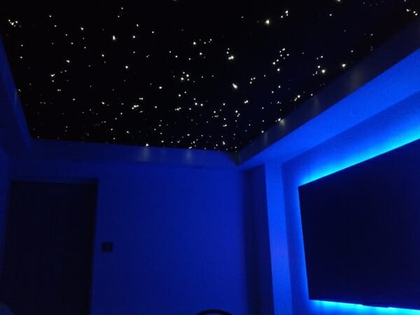 When SciFi movie enthusiast Steve Cockburn decided it was time to create a dedicated home cinema room he was more than up for the technical challenges of the build, but decided that he’d come to the experts for the star ceiling which was part of his vision. He lives close enough to Starscape to drive up and have a look at our Infinity demonstration area, and having seen it, decided that Infinity was the way to go. Since the room is not huge, a coffered array of 6 panels in a 3 x 2 metre coffered ceiling would fit nicely, and Steve opted to use the magnetic mounting package.