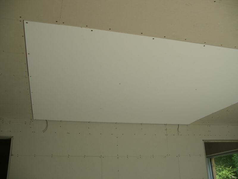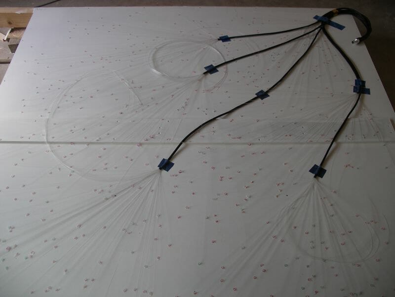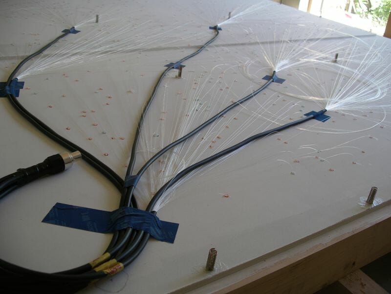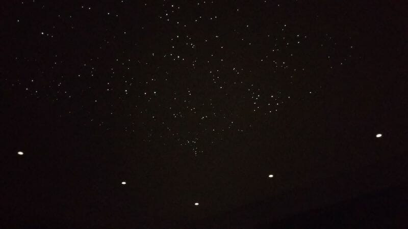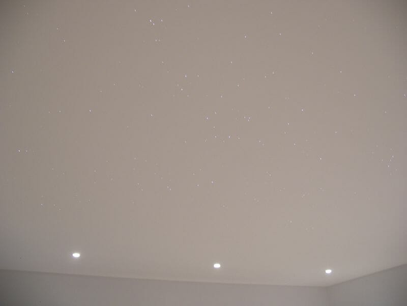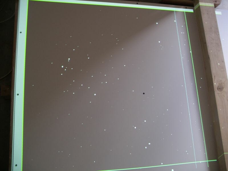 Seb writes; “The larger fibres in the starfield were placed based on actual constellations, while the rest were generated with some software I wrote (“Starfield Generator”). There are approximately 600 fibres/stars – actually a few less as I found that the ‘Infinity mix’ had a few too many of the larger fibres (I understand the Infinity mix has since been updated to a better balance). To drill the holes I used a Dremel Plunge Router attachment. It’s not exactly a precision bit of kit, but it made it fairly easy to drill tiny holes in the 15mm (30mm at the joint in the middle) MDF without snapping too many drill bits. I think I went through about 3x 0.6mm bits when drilling the holes for the 400+ 0.5mm fibres. I initially allowed a 1mm gap between the panel and the plaster stop beading, and filled this with a flexible adhesive. This produced an almost invisible joint, but unfortunately the movement of the MDF proved to be too great for such a small gap, and cracks soon started to appear. So I opened up the gaps to around 4-5mm (using a rail saw on the ceiling), and then refilled with flexible adhesive (Everbuild Stixall). This makes the joint more visible, but seems to be more robust. The twinkle wheel supplied with the light source did not twinkle in a very pleasing way – it turned whole blocks of stars on and off as it turned rather than giving a gentle/realistic twinkle. I replaced the holey disc with a piece of fine metal mesh which works much better. After the fibres were trimmed flush, the panel was given another 2 coats of white paint. This makes the fibres completely invisible when the stars are turned off. Even with the light source on the lowest setting, they are still plenty bright enough in a dark room. Perhaps a bit too bright – I need to have a look at hacking the light source to provide more dimming range. The next phase is to air-brush some nebulae over the whole ceiling using UV paint. This is white under normal light, so should be invisible until the UV LEDs are turned on. This will help the starfield further blend into the whole ceiling.”