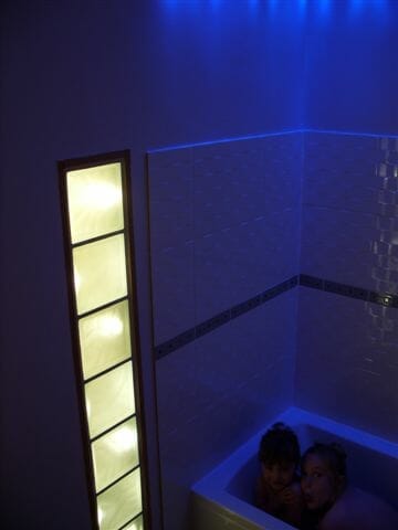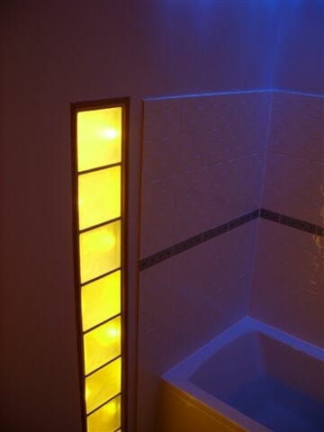 One thing which is worth saying, is that there was plenty of spare capacity in the light source, so Graham had the option of adding other lighting effects either in the bathroom or in the adjoining hallway. The initial plan was to have some fibre optic lighting in the coving, but in the end Graham settled for some blue LEDs in the ceiling, and this provides the contrast between the static colour of the LEDs and the changing colours in the glass blocks.