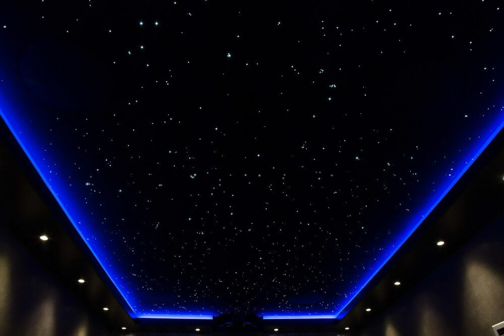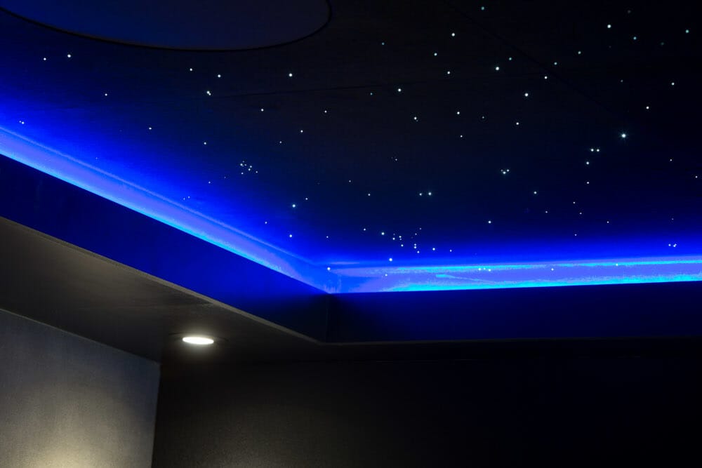 Interesting features in this photo include the speaker cut-outs in the star panels at the rear of the room, and the clusters of stars which are easily visible. Still photos of star ceilings don’t always do them justice because the twinkle wheel in the light source means that some of your stars will always be dimmed and thus absent from the photograph, unless it’s a long exposure.Blue LED tape in the perimeter bulkhead adds a secondary lighting feature, while the bulkhead also provides a good location for mounting downlights.Another nicely exposed photo of the Infinity star ceiling showing off the little clusters of stars and also the relatively empty areas. Because we do have relatively empty areas – like the real night sky, the areas in the background where the speakers are don’t appear particularly obvious. It’s possible to adjust both the speed and intensity of the twinkling effect to suit your personal preference.On the issue of brightness, dimmer stars generally look more realistic, so we’d normally advise against having the light source set too bright.