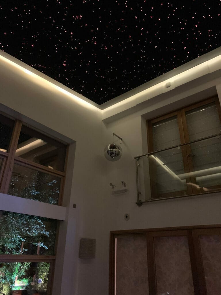 Starscape’s Infinity star ceiling panels are chiefly aimed at the home cinema sector, where the addition of a gently twinkling star ceiling helps to create that special ambience which makes movie watching into an event, rather than just part of daily routine. Home cinemas are bit womb like – dark, isolated and enclosed – deliberately isolated from the rest of the house and the outdoor world. However, in this project the star ceiling is part of a room designed to deliberately embrace the outside – to create a transition between the outdoors and interior of the house.
