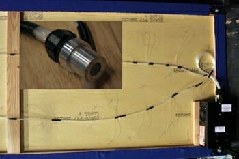 In the photo above, the fabric which covers the front of the flat is visible, as is the aluminium ferrule or “common end” which is used to terminate the harness.