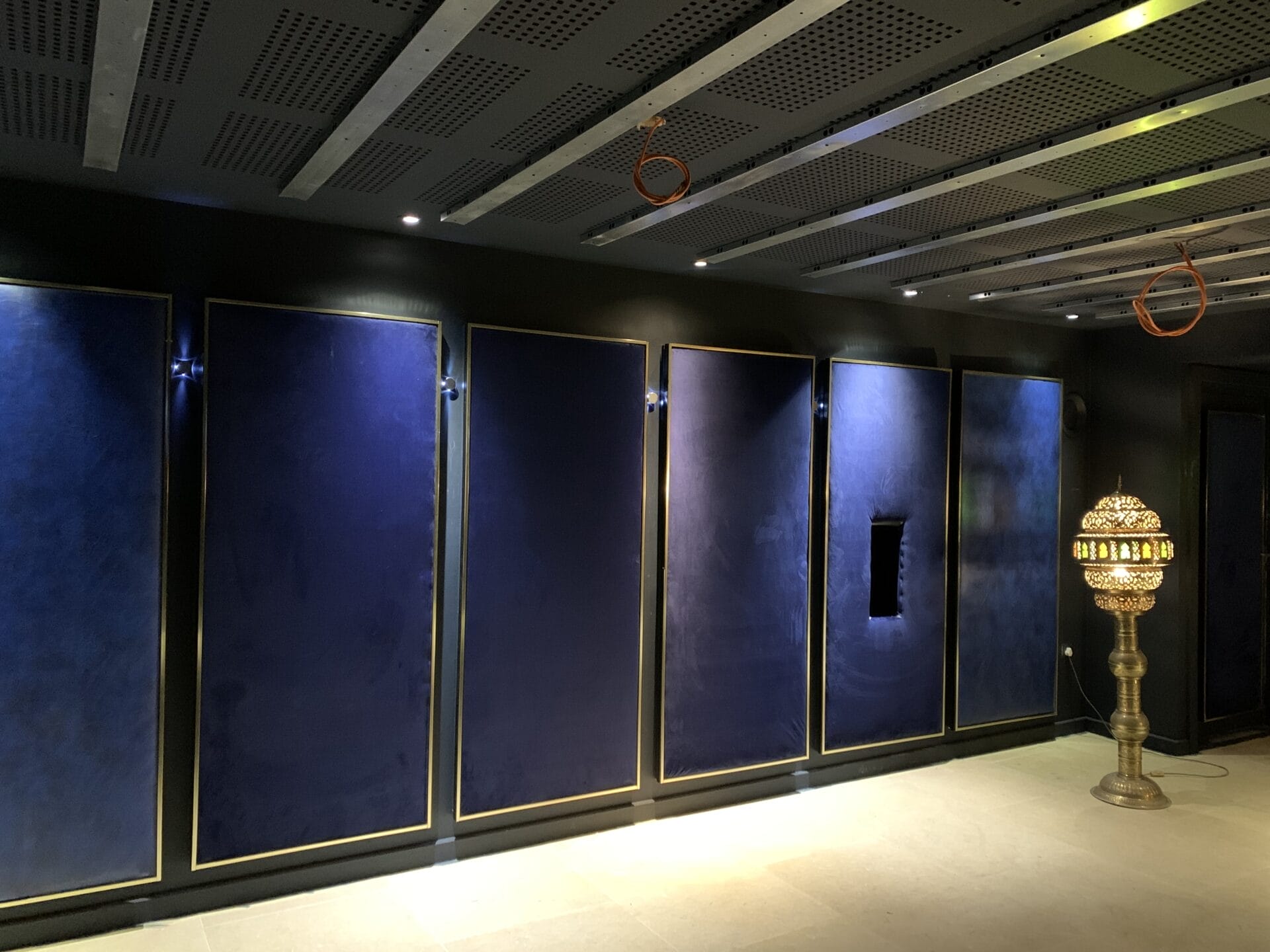 In order to fulfil this, Zebra created additional space behind the walls, meaning that each of the bespoke upholstered wall panels is actually a door. Hidden behind these are the various pieces of technical equipment required for the room, the client’s collection of DVDs, Blue-Rays and other media, as well as general storage.