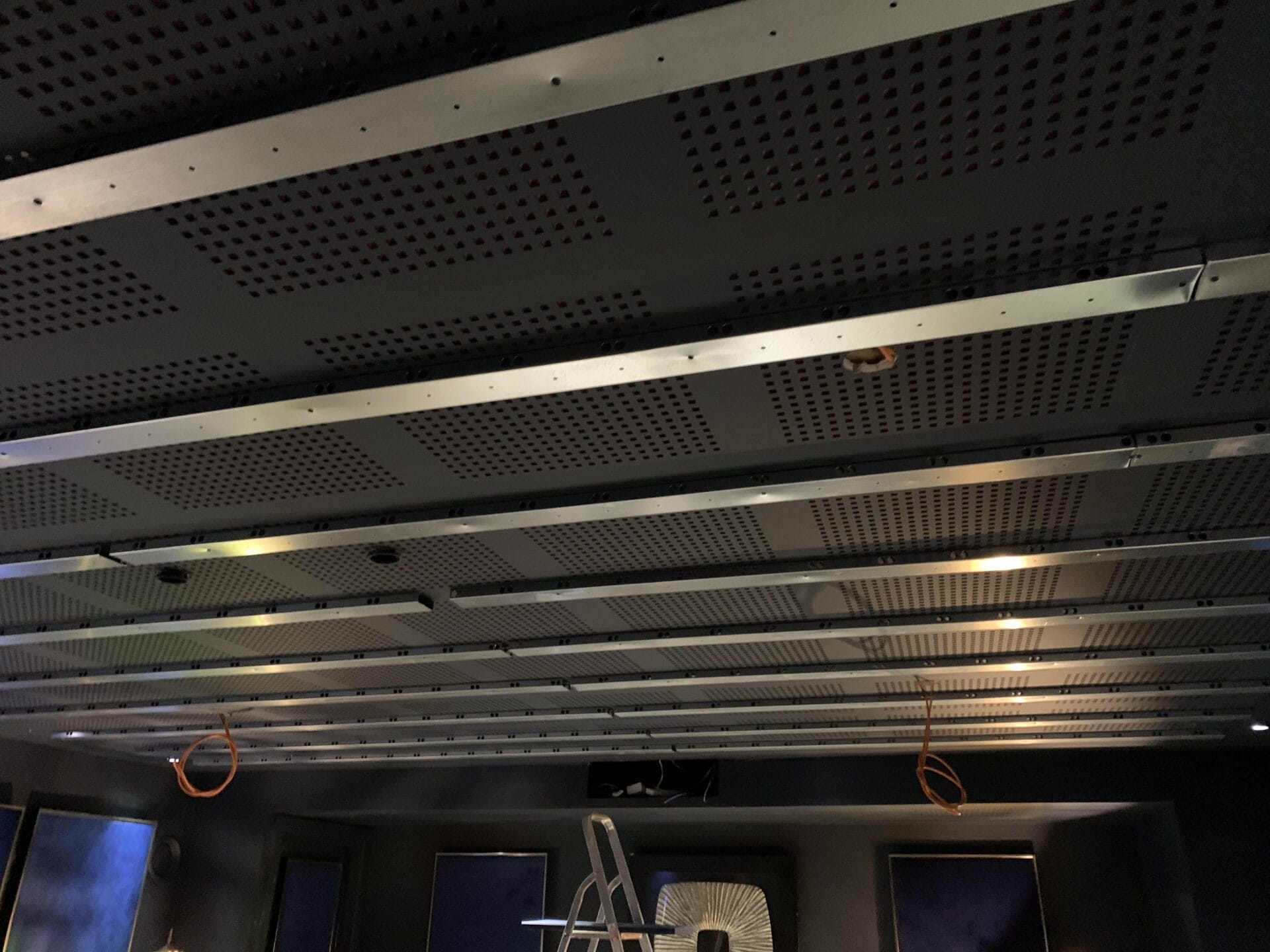 The lack of floor mounted speakers meant that creative solutions were required for positioning, and so every speaker is mounted in either the walls or ceiling, or behind the screen.