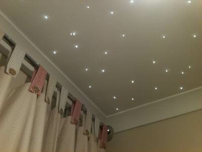 “The photo of the room is a little over-exposed,” says Leigh. “The room doesn’t light up as much as the photo shows. I’ve also left the fibres about 5mm past the ceiling line (for future painting), which gives each star more of a glow. Everyone who has seen it is well impressed.