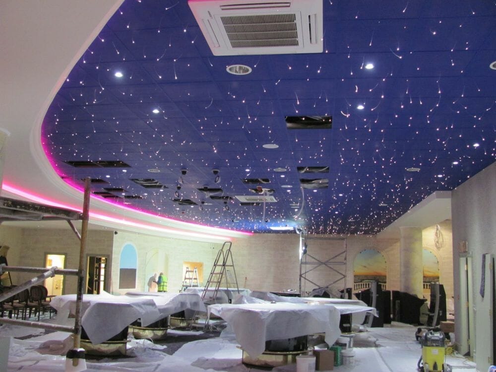 Conventional suspended grid ceiling systems lend themselves well to installation of fibre optics, as seen in this project. We supplied the 600 x 600mm mineral ceiling tiles with the optical fibres already in place for the main contractor to simply drop into the grid. Panels were installed above the swimming pool (seen here) and in the music room.