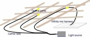 There’s another even easier solution: using our optical jointing system we can supply you with a “mini-harness” for each panel. This bundle of relatively short fibres terminates in a small ferrule which connects to a similar one at the end of a longer ‘tail’ which is part of a harness of several such tails carrying light from the light source.