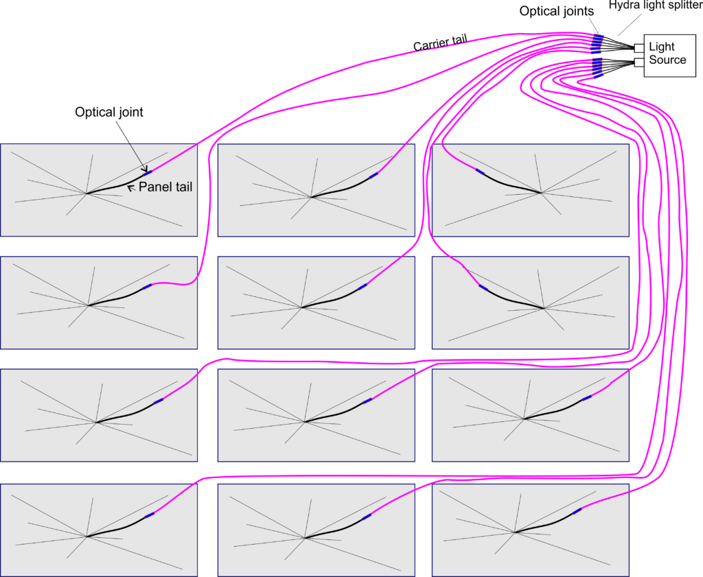 Light from the MiniLED550 is split into 6 outputs by the Hydra. A carrier tail of appropriate length then carries the light to the panel tail.